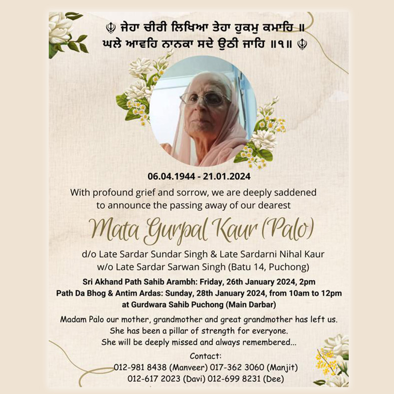 Path da Bhog & Antim Ardaas on Sunday, 28 January, from 10am to 12pm, Gurdwara Sahib Puchong (Main Darbar)