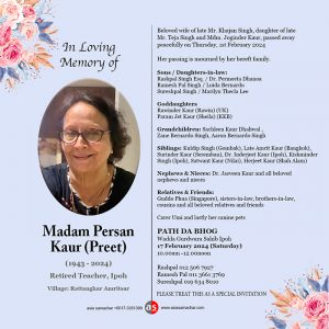 Madam Persan Kaur (Preet) (1943 – 2024), Retired Teacher, Ipoh