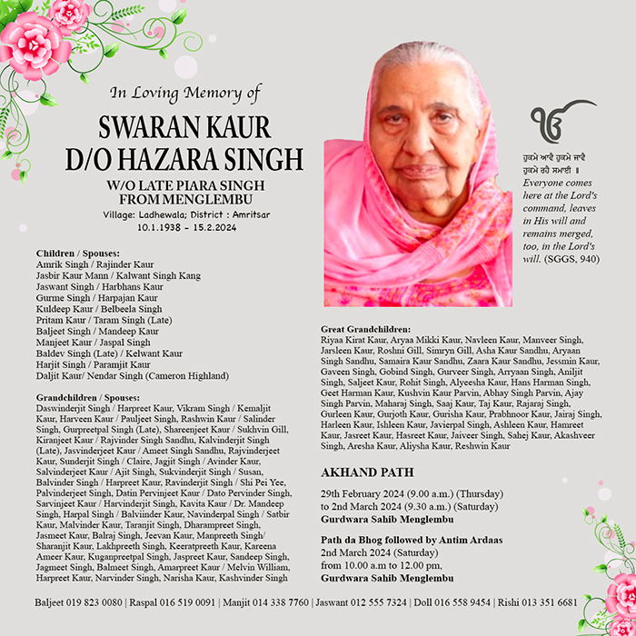 ASIA SAMACHAR is an online newspaper for Sikhs / Punjabis in Southeast Asia and beyond. You can leave your comments at our website, Facebook, Twitter, and Instagram. We will delete comments we deem offensive or potentially libelous. You can reach us via WhatsApp +6017-335-1399 or email: asia.samachar@gmail.com. For obituary announcements, click here