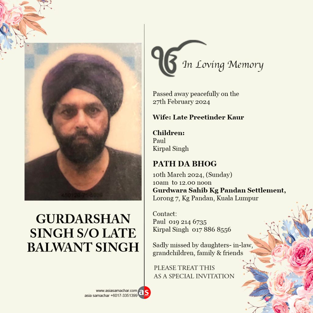 ASIA SAMACHAR is an online newspaper for Sikhs / Punjabis in Southeast Asia and beyond. You can leave your comments at our website, Facebook, Twitter, and Instagram. We will delete comments we deem offensive or potentially libelous. You can reach us via WhatsApp +6017-335-1399 or email: asia.samachar@gmail.com. For obituary announcements, click here