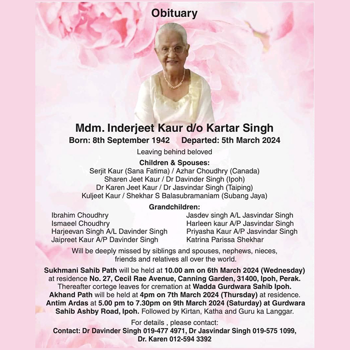 Sukhmani Sahib Path will be held at 10.00 am on 6th March 2024 (Wednesday) at residence No 27, Cecil Rae Avenue, Canning Garden, 31400, Ipoh, Perak