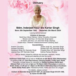 Sukhmani Sahib Path will be held at 10.00 am on 6th March 2024 (Wednesday) at residence No 27, Cecil Rae Avenue, Canning Garden, 31400, Ipoh, Perak