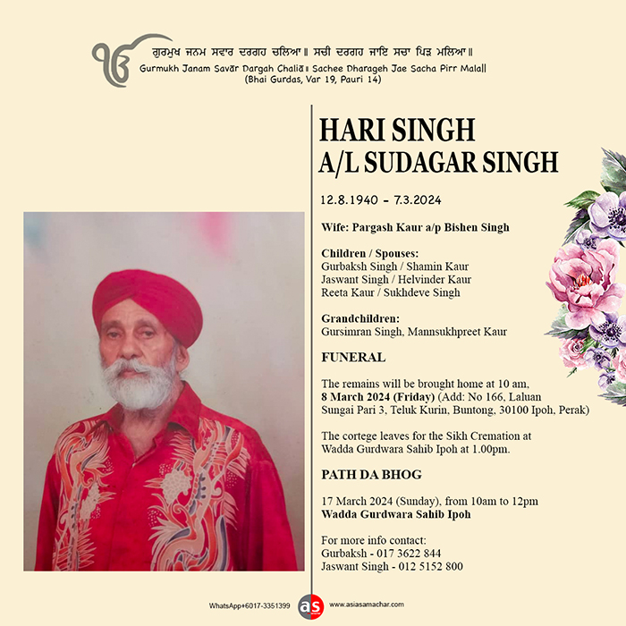 ASIA SAMACHAR is an online newspaper for Sikhs / Punjabis in Southeast Asia and beyond. You can leave your comments at our website, Facebook, Twitter, and Instagram. We will delete comments we deem offensive or potentially libelous. You can reach us via WhatsApp +6017-335-1399 or email: asia.samachar@gmail.com. For obituary announcements, click here