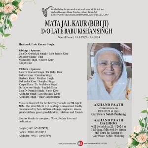 Mata Jal Kaur left for her heavenly abode on 7th April 2024. Our dear Bibi Ji will be deeply missed and fondly remembered by her children, siblings, nephews, nieces, grandchildren, great-grandchildren, relatives and friends.