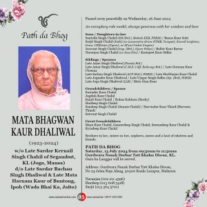 ASIA SAMACHAR is an online newspaper for Sikhs / Punjabis in Southeast Asia and beyond. You can leave your comments at our website, FacebookTwitter, and Instagram. We will delete comments we deem offensive or potentially libelous. You can reach us via WhatsApp +6017-335-1399 or email: asia.samachar@gmail.com. For obituary announcements, click here