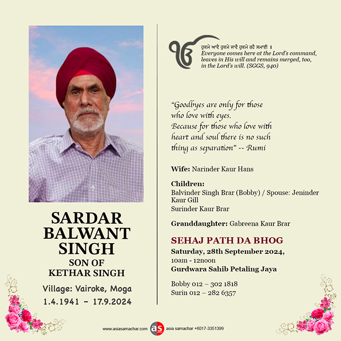 ASIA SAMACHAR is an online newspaper for Sikhs / Punjabis in Southeast Asia and beyond. You can leave your comments at our website, Facebook, Twitter, and Instagram. We will delete comments we deem offensive or potentially libelous. You can reach us via WhatsApp +6017-335-1399 or email: asia.samachar@gmail.com. For obituary announcements, click here