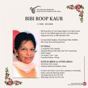 Bibi Roop Kaur d/o Late Pargan Singh & Late Mata Gormit Kaur d/o Late Milkah Singh and wife to Late Kaka Ratan Singh passed away on 20th September 2024.