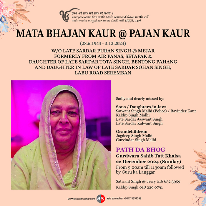 ASIA SAMACHAR is an online newspaper for Sikhs / Punjabis in Southeast Asia and beyond. You can leave your comments at our website, FacebookTwitter, and Instagram. We will delete comments we deem offensive or potentially libelous. You can reach us via WhatsApp +6017-335-1399 or email: asia.samachar@gmail.com. For obituary announcements, click here