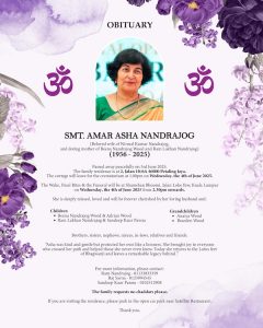 The Wake, Final Rites & the Funeral will be at Shamshan Bhoomi, Jalan Loke Yew, Kuala Lumpur on Wednesday, the 4th of June 2025 from 2.30pm onwards.