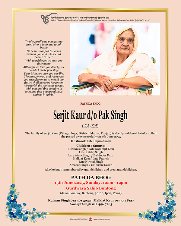 The family of Serjit Kaur (Village: Joga; District: Mansa, Punjab) is deeply saddened to inform that she passed away peacefully on 4th June 2025