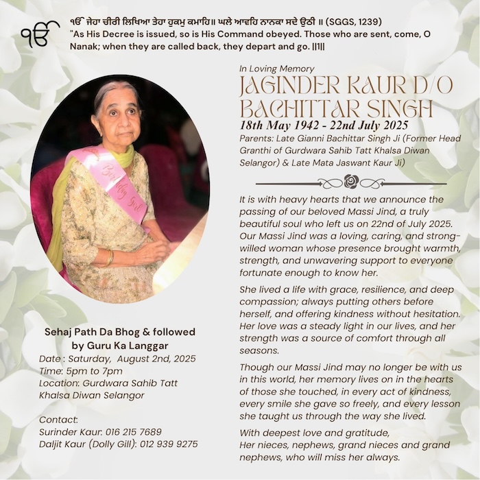 Jaginder Kaur (1942 – 2025), Tatt Khalsa / Kuala Lumpur