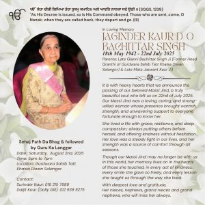 Parents: Late Gianni Bachittar Singh Ji (Former Head Granthi of Gurdwara Sahib Tatt Khalsa Diwan Selangor) & Late Mata Jaswant Kaur Ji)