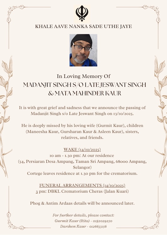 It is with great grief and sadness that we announce the passing of Madanjit Singh s/o Late Jeswant Singh on 13 October 2025.