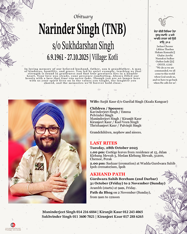 ASIA SAMACHAR is an online newspaper for Sikhs / Punjabis in Southeast Asia and beyond. You can leave your comments at our website, Facebook, Twitter, and Instagram. We will delete comments we deem offensive or potentially libelous. You can reach us via WhatsApp +6017-335-1399 or email: asia.samachar@gmail.com. For obituary announcements, click here
