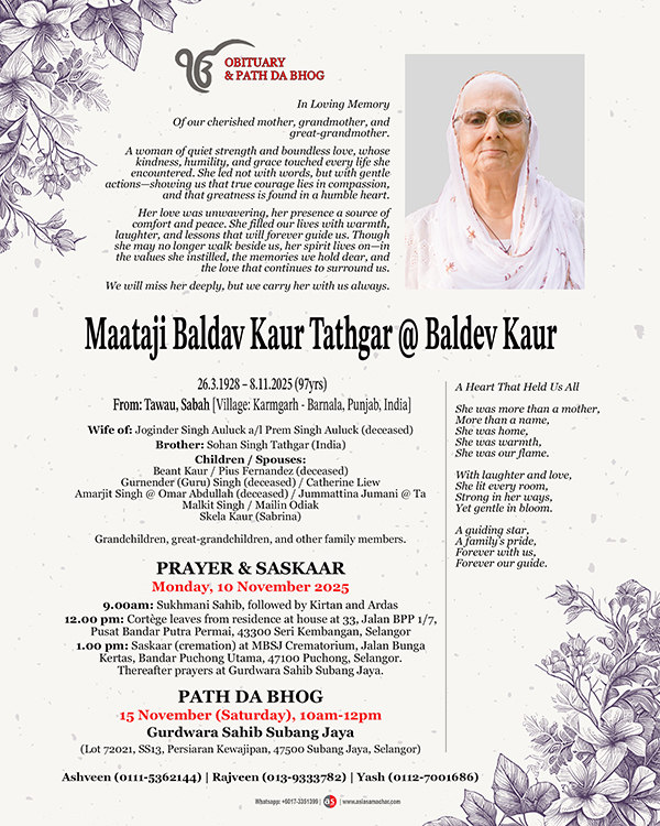 ASIA SAMACHAR is an online newspaper for Sikhs / Punjabis in Southeast Asia and beyond. You can leave your comments at our website, Facebook, Twitter, and Instagram. We will delete comments we deem offensive or potentially libelous. You can reach us via WhatsApp +6017-335-1399 or email: asia.samachar@gmail.com. For obituary announcements, click here