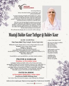 1.00 pm: Saskaar (cremation) at MBSJ Crematorium, Jalan Bunga Kertas, Bandar Puchong Utama, 47100 Puchong, Selangor. Thereafter prayers at Gurdwara Sahib Subang Jaya.