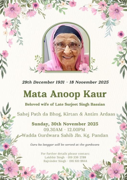 ASIA SAMACHAR is an online newspaper for Sikhs / Punjabis in Southeast Asia and beyond. You can leave your comments at our website, FacebookTwitter, and Instagram. We will delete comments we deem offensive or potentially libelous. You can reach us via WhatsApp +6017-335-1399 or email: asia.samachar@gmail.com. For obituary announcements, click here