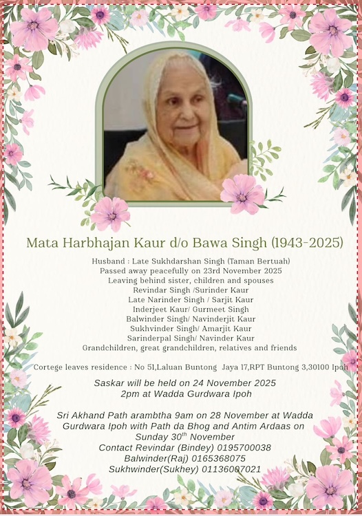 Sri Akhand Path arambtha 9am on Friday, 28th November at Wadda Gurdwara Sahib Ipoh with Path da Bhog and Antim Ardaas on Sunday, 30th November 2025
