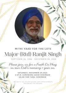 First Mithi Yaad: Major (Rtd) Ranjit Singh (1936 – 2024)