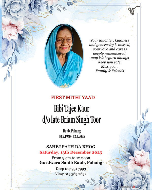 ASIA SAMACHAR is an online newspaper for Sikhs / Punjabis in Southeast Asia and beyond. You can leave your comments at our website, Facebook, Twitter, and Instagram. We will delete comments we deem offensive or potentially libelous. You can reach us via WhatsApp +6017-335-1399 or email: asia.samachar@gmail.com. For obituary announcements, click here
