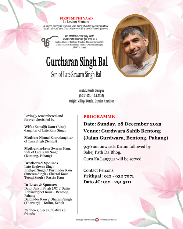 ASIA SAMACHAR is an online newspaper for Sikhs / Punjabis in Southeast Asia and beyond. You can leave your comments at our website, Facebook, Twitter, and Instagram. We will delete comments we deem offensive or potentially libelous. You can reach us via WhatsApp +6017-335-1399 or email: asia.samachar@gmail.com. For obituary announcements, click here