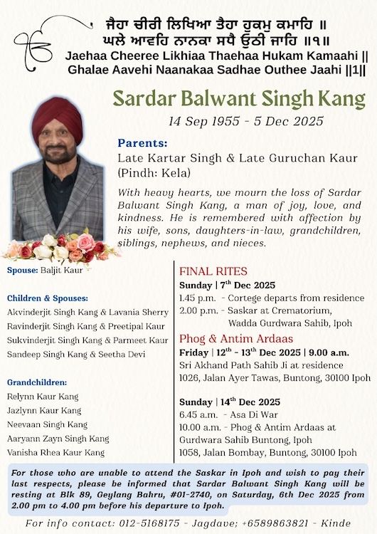 For those who are unable to attend the Saskar in Ipoh and wish to pay their last respects, please be informed that Sardar Balwant Singh Kang will be resting at Bik 89, Geylang Bahru, #01-2740, on Saturday, 6th Dec 2025 from 2.00 pm to 4.00 pm before his departure to Ipoh.