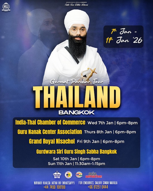 Bhai Harinder Singh of Nirvair Khalsa Jatha UK will lead a five-day Gurmat Parchar Tour in Bangkok, Thailand, from 7 to 11 January 2026. The tour will commence on 7 January with a programme at the India–Thai Chamber of Commerce and conclude with two consecutive days of programmes at Gurdwara Siri Guru Singh Sabha Bangkok.
