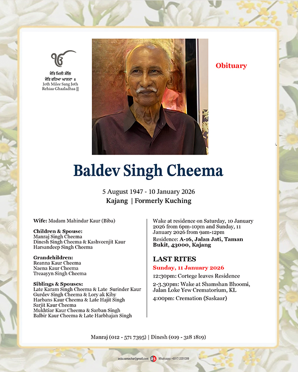 ASIA SAMACHAR is an online newspaper for Sikhs / Punjabis in Southeast Asia and beyond. You can leave your comments at our website, Facebook, Twitter, and Instagram. We will delete comments we deem offensive or potentially libelous. You can reach us via WhatsApp +6017-335-1399 or email: asia.samachar@gmail.com. For obituary announcements, click here