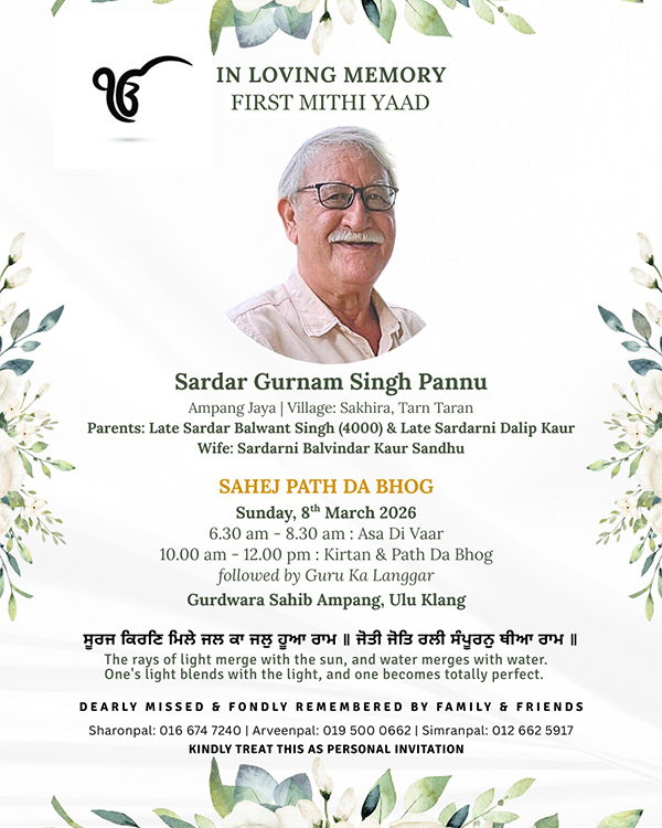ASIA SAMACHAR is an online newspaper for Sikhs / Punjabis in Southeast Asia and beyond. You can leave your comments at our website, Facebook, Twitter, and Instagram. We will delete comments we deem offensive or potentially libelous. You can reach us via WhatsApp +6017-335-1399 or email: asia.samachar@gmail.com. For obituary announcements, click here
