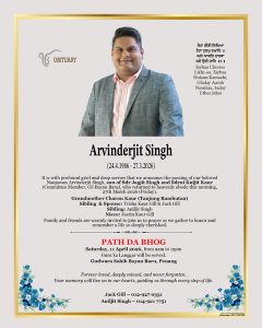 It is with profound grief and deep sorrow that we announce the passing of our beloved Naujawan Arvinderjit Singh, son of Sdr Jagjit Singh and Sdrni Kuljit Kaur (Committee Member, GS Bayan Baru), who returned to heavenly abode this morning, 27th March 2026 (Friday).