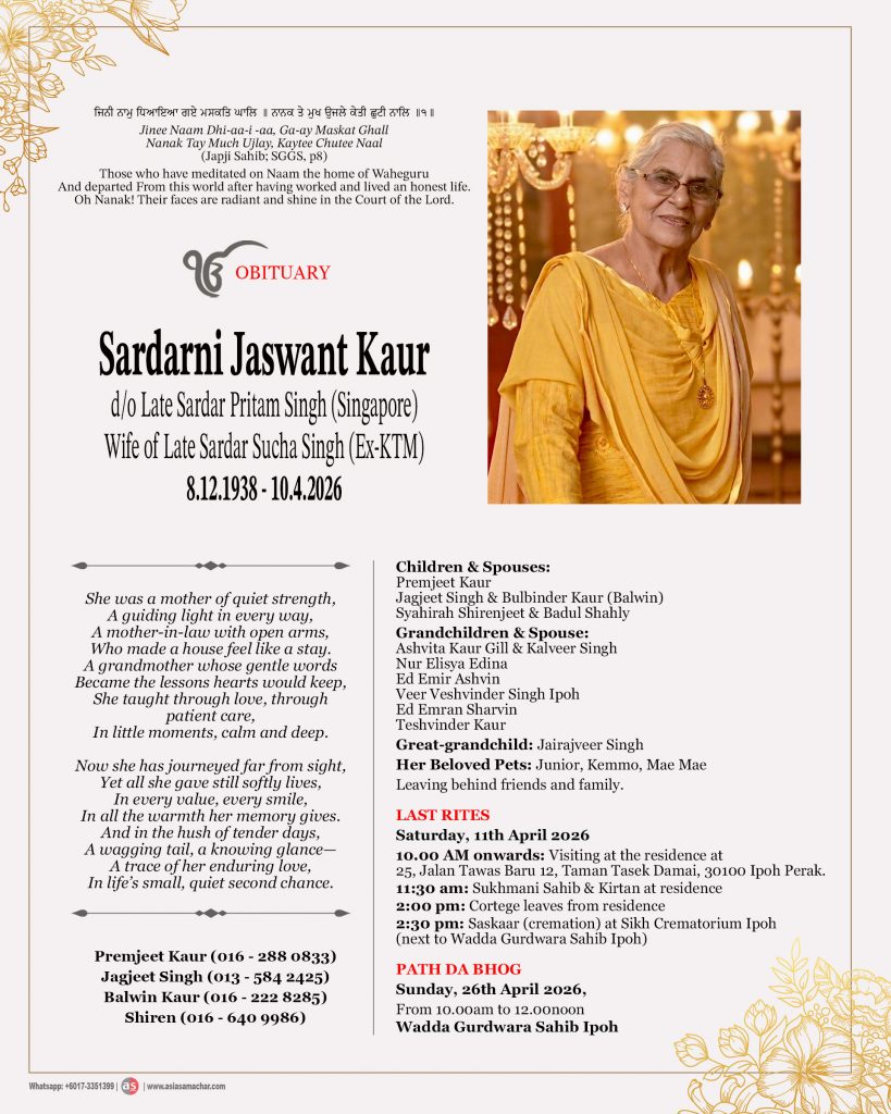 ASIA SAMACHAR is an online newspaper for Sikhs / Punjabis in Southeast Asia and beyond. You can leave your comments at our website, Facebook, Twitter, and Instagram. We will delete comments we deem offensive or potentially libelous. You can reach us via WhatsApp +6017-335-1399 or email: asia.samachar@gmail.com. For obituary announcements, click here