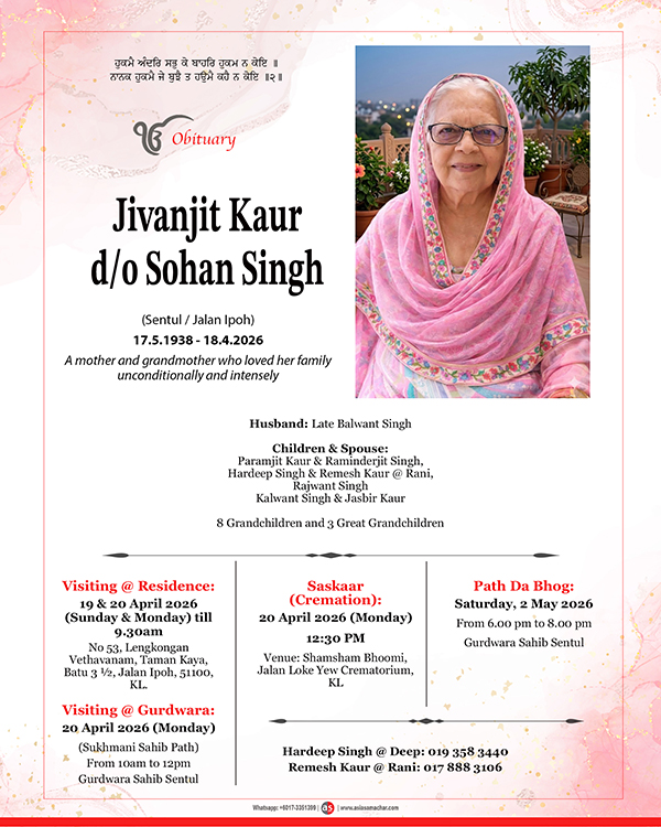 ASIA SAMACHAR is an online newspaper for Sikhs / Punjabis in Southeast Asia and beyond. You can leave your comments at our website, FacebookTwitter, and Instagram. We will delete comments we deem offensive or potentially libelous. You can reach us via WhatsApp +6017-335-1399 or email: asia.samachar@gmail.com. For obituary announcements, click here