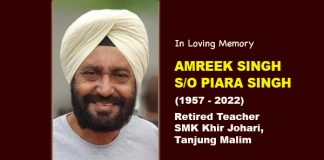Amreek Singh (1957 – 2022), Retired Teacher SMK Khir Johari, Tanjung...