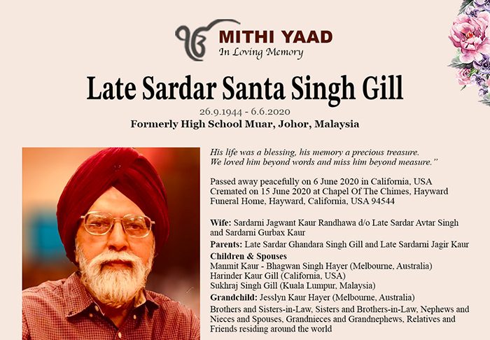 Saskaar: 12 pm, 1 August 2017, at Wadda Gurdwara Sahib Ipoh crematorium| Malaysia