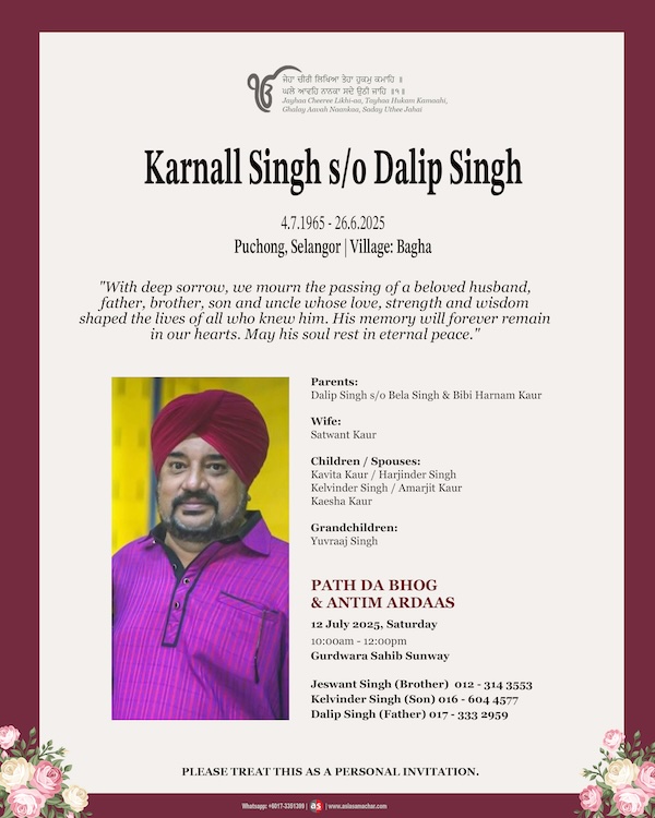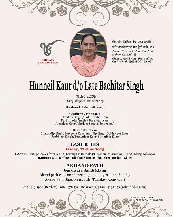 LAST RITES 26 June 2025, Thursday 1.00pm onwards: Last respects at Gurdwara Sahib Johor Bahru (GSJB) 2.45 pm: Cortege leaves from GSJB 3.30pm: Saskaar (cremation) at Hindu Crematorium, Jalan Kebun Teh 4.00pm: Kirtan Sohila 4 30pm: Alahnia path at GSJB Langgar will be served at GSJB