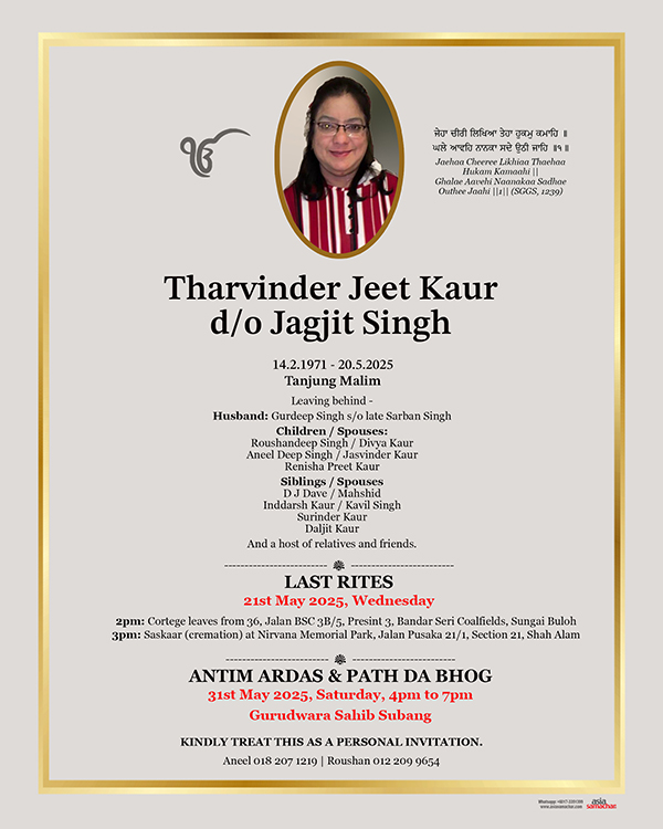 LAST RITES 19 May 2025, Monday 11.30am-2.30 pm: Wake at residence No. 30, Jalan 3/1A, Taman Serdang Jaya, 43300 Seri Kembangan, Selangor 2:30pm: Cortege leaves residence 3.00pm – 5.00: Wake at Shamshan Bhoomi Hall, Jalan Loke Yew Crematorium, KL 5:00pm: Antam Sanskar (cremation) Followed by Ardaas and Path at Gurdwara Sahib Serdang, Selangor